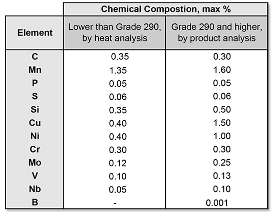 A694规范中的每个等级都分配了该等级所需的最小屈服强度(以KSI单位)相关的数字;例如,级别的最低屈服强度为52 KSI。